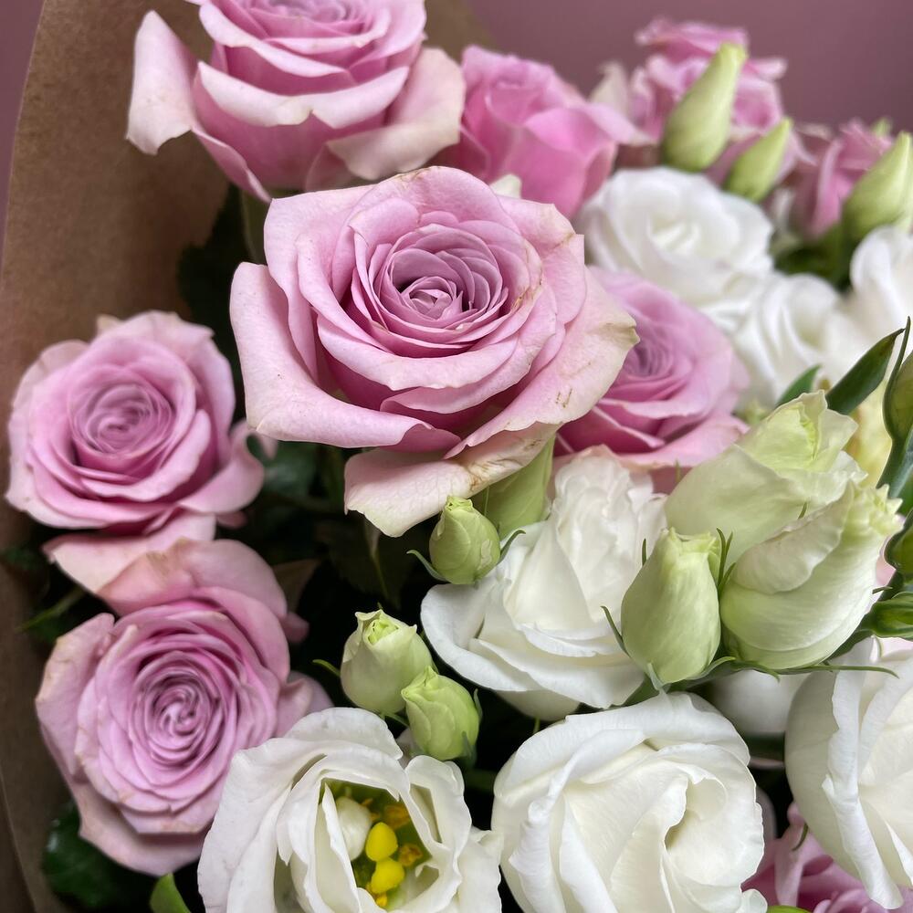 Кустовая пионовидная роза – 3 шт.Маттиола – 10 шт.Эвкалипт Baby Blue – 2 шт.Пленка матовая – 2 шт.