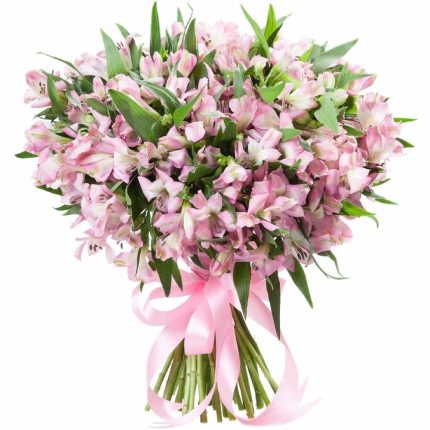 Корзина с лилией, белыми розами, альстромерией и декоративной зеленью «Весенний сад»