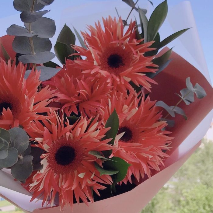 Рускус – 1 шт.Эвкалипт – 1 шт.Лента атласная – 1 шт.Упаковка дизайнерская – 1 шт.инструкция по уходу за цветами – 1 шт.любовь флориста – 1 шт.махровая гербера – 5 шт.витамины для цветов – 1 шт.