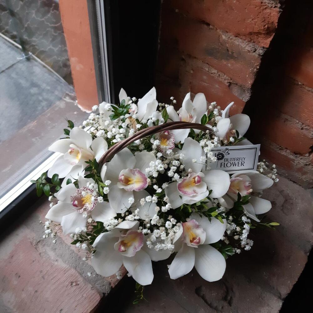 ЦИМБИДИУМ – 11 шт.Самшит – 5 шт.Гипсофила – 5 шт.Корзина – 1 шт.Оазис – 1 шт.