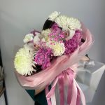 Букет с пионами и хризантемой в дизайнерском оформлении