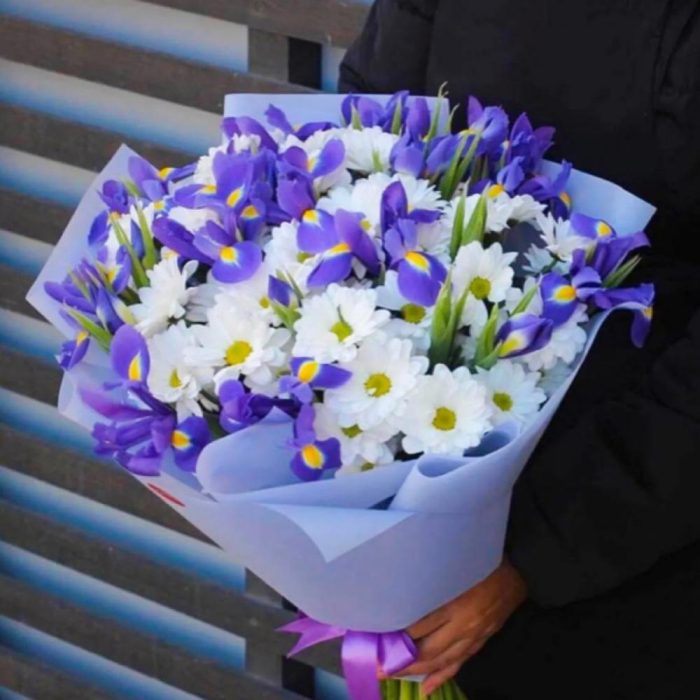 ирисы синие – 21 шт.Хризантема кустовая – 5 шт.Дизайнерская упаковка – 1 шт.