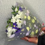 Хризантема кустовая – 4 шт.Альстромерия – 1 шт.Ирис – 4 шт.фисташка зелень – 3 шт.Упаковка – 1 шт.