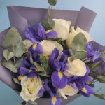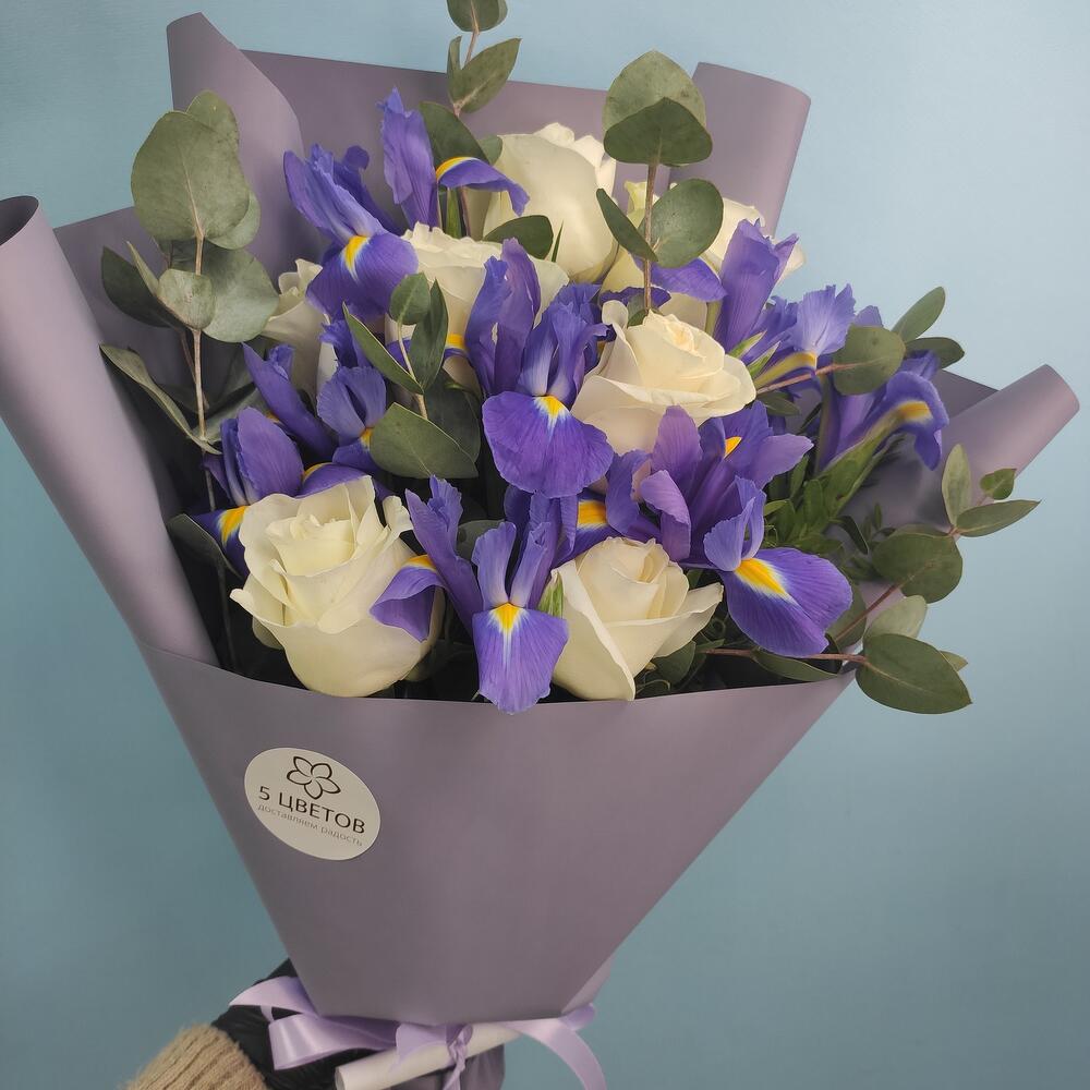ирисы синие – 8 шт.розы белые mondial – 7 шт.зелень фисташка и эвкалипт – 1 шт.Упаковка матовая пленка – 1 шт.Атласная лента – 1 шт.