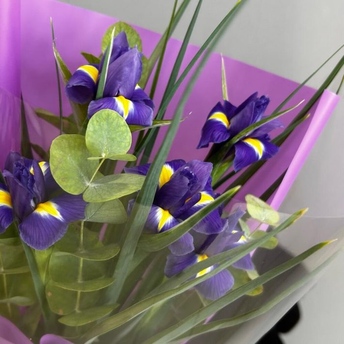 Букет из ярких ирисов и ароматного эвкалипта