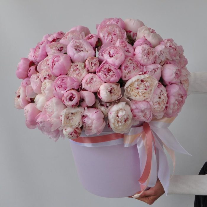 Лента атласная – 1 шт.Коробка шляпная – 1 шт.Пион Сара Бернар – 65 шт.Оазис флористический – 3 шт.