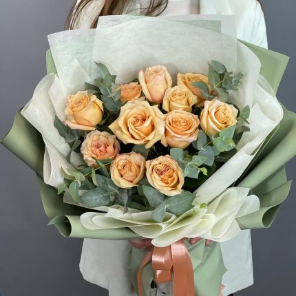 Лента – 2 шт.Роза кустовая – 4 шт.Эвкалипт – 3 шт.Роза одноголовая – 7 шт.Роза кустовая пионовидная – 3 шт.Упаковка дизайнерская – 3 шт.