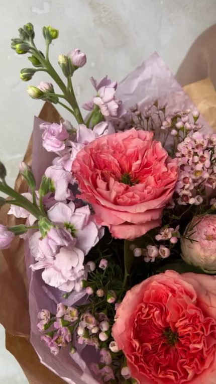 Букет с пионовидной кустовой розой, ваксфлаувером и маттиолой