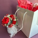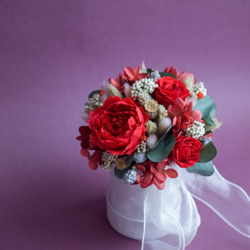 Композиция из сухоцветов и стабилизированных цветов в шляпной коробке (красная)