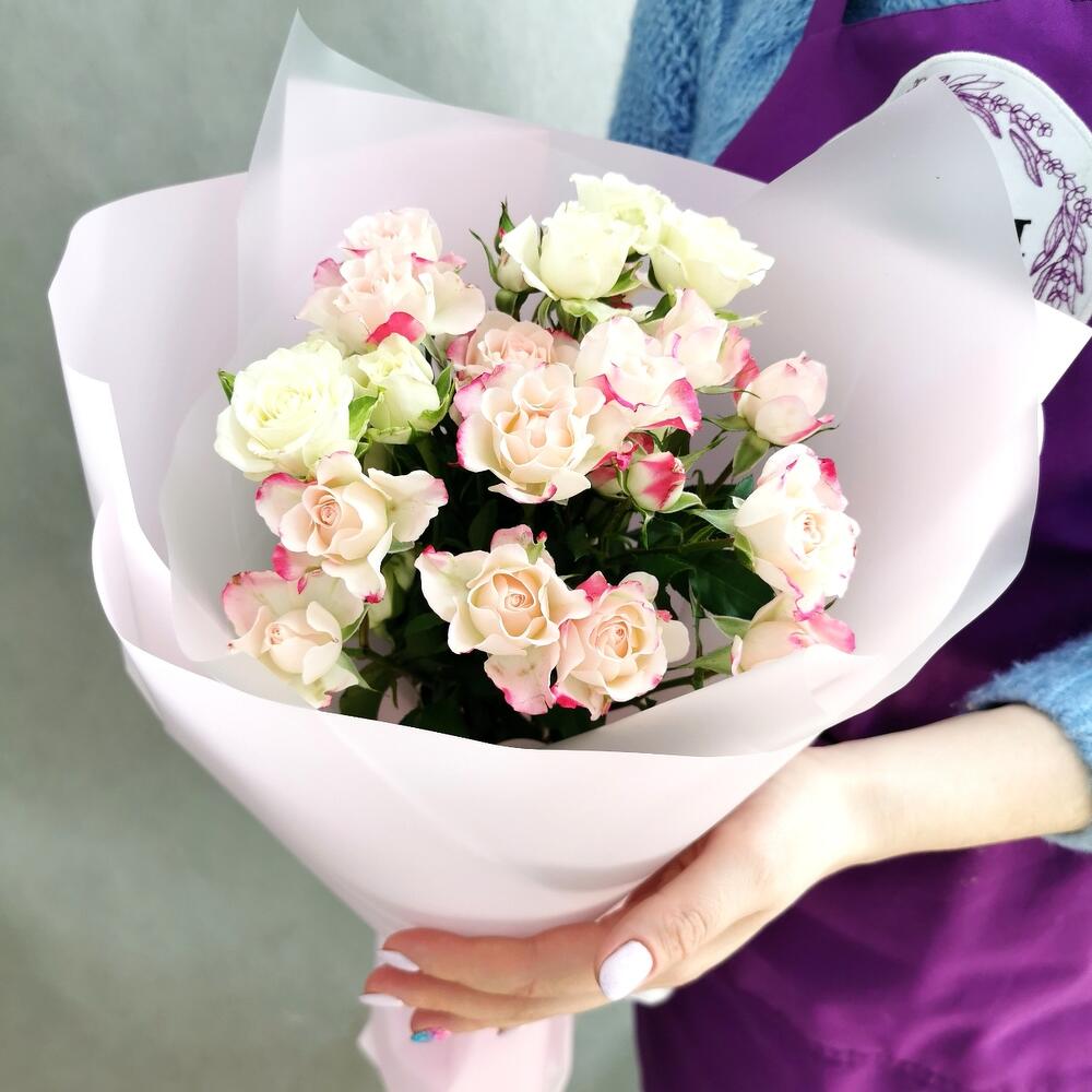 Нежный букет с кустовой розой в стильной дизайнерской упаковке
