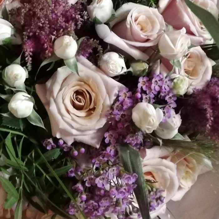 Ваксфлауэр – 6 шт. Вероника – 3 шт. Калла – 3 шт. Роза кустовая – 5 шт. Роза – 17 шт. Гвоздика – 3 шт. Берграсс – 6 шт. Паникум Фонтан – 4 шт. Оформление – 1 шт. Астильба Европа – 3 шт. Лизиантус – 4 шт.