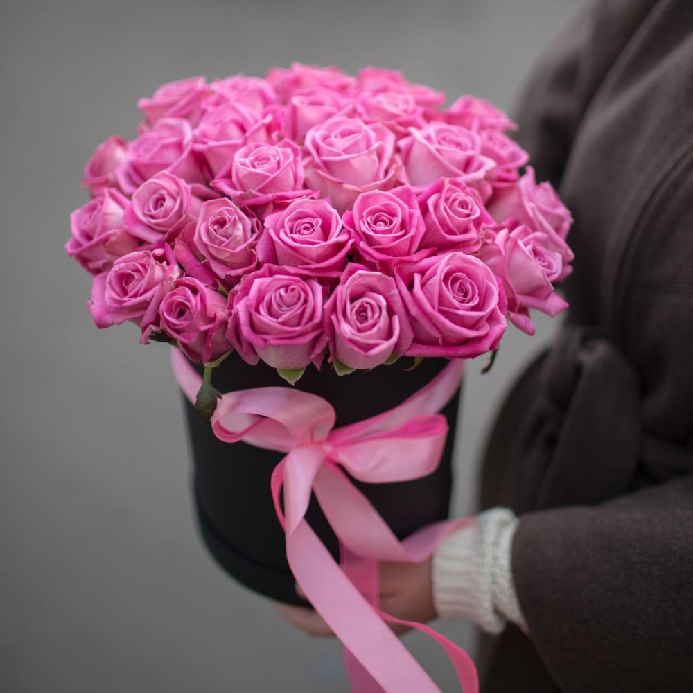 Роза розовая Аква – 51 шт.Оазис – 1 шт.Шляпная коробка – 1 шт.