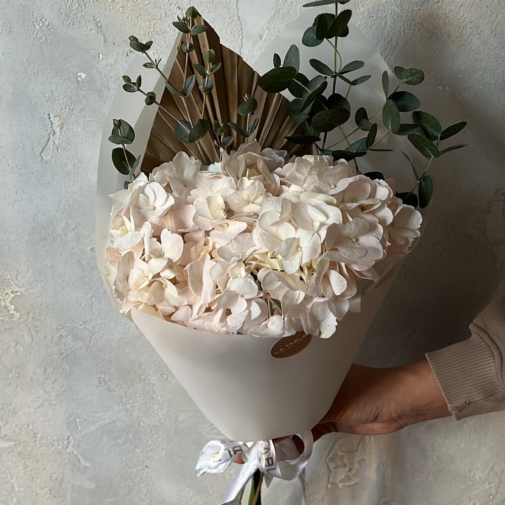 Гортензия розовая – 1 шт.Эвкалипт – 1 шт.Сухоцвет – 1 шт.Упаковка дизайнерская – 1 шт.