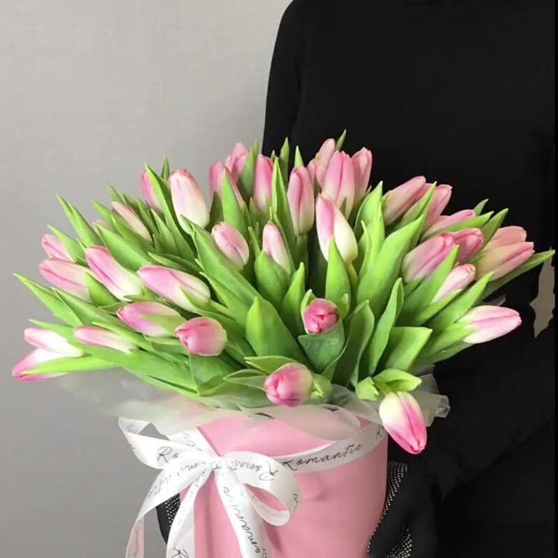 51 тюльпан в аквабоксе и в шляпной коробке