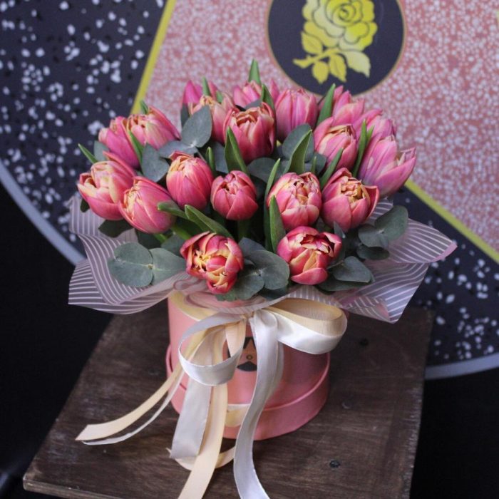 тюльпан пионовидный коламбус – 19 шт.Эвкалипт – 2 шт.Пленка дизайнерская – 1 шт.Шляпная коробка – 1 шт.