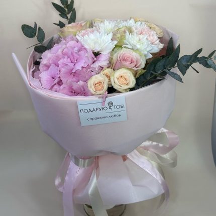 Хризантемы и Пионовидные кустовые розы в коробке + открытка ручной работы в подарок
